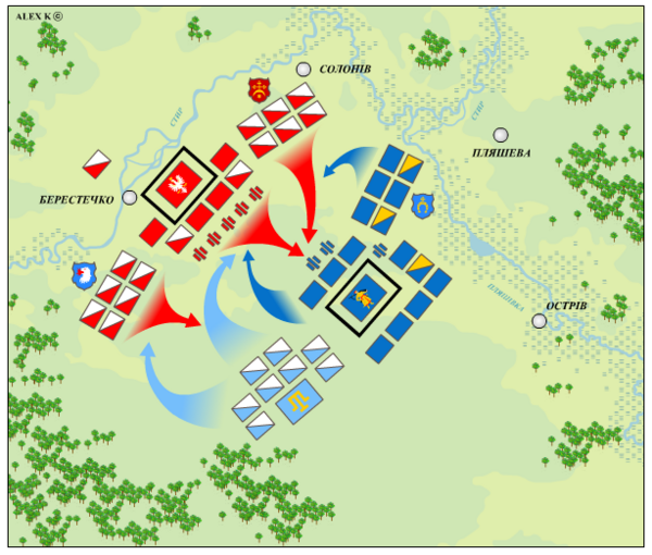 20 (30) июня утром король, который молился всю ночь, выстроил свою армию в таком порядке: правое крыло — гетман Потоцкий, левое — гетман Калиновский. В центре, где преимущественно строится польская и немецкая пехота — сам король. Мосты через Стыр разбираются.