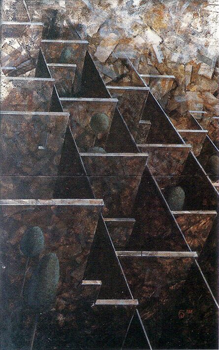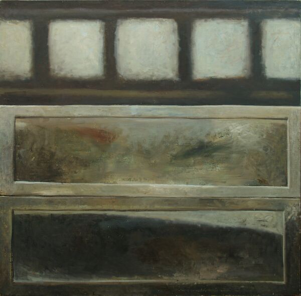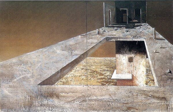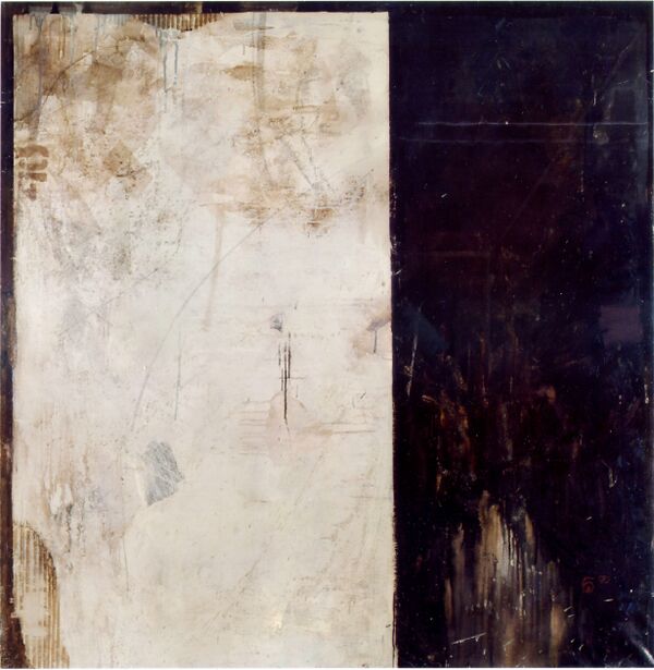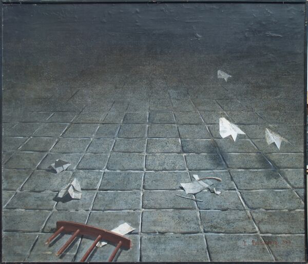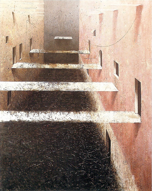 … Пронзительный полет и вертикальное приземление. Таково впечатление от картин Михаила Берзинга. Летишь, приземляешься на плоскость, бродишь по ней, ныряешь в аккуратно вырезанный проем. Рассекаемое пространство издает резкие металлические звуки. Возникает трагическое ощущение пустоты. Побродив по сочленению горизонтальных серых, желтоватых, розовеющих плоскостей, садишься на край бездны, болтаешь ногами. Потом полет. Дух захватывает от одиночества («Фрагмент ландшафта»).