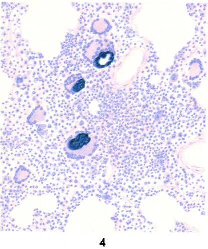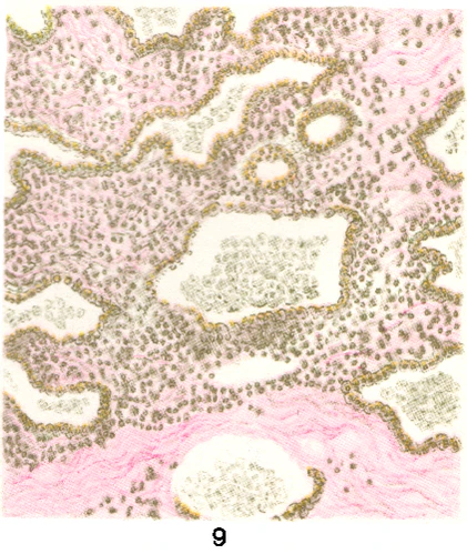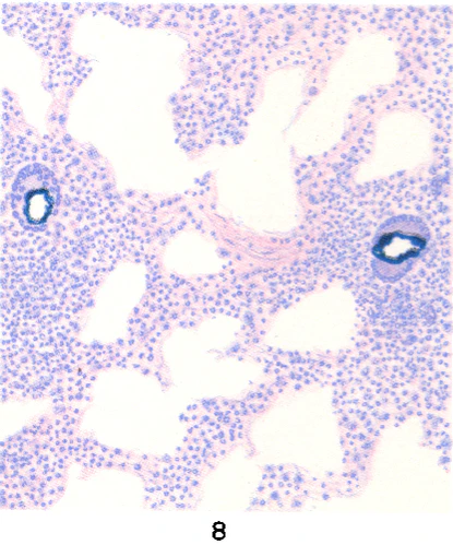 Следствием гиперергической реакции является формирование характерного альвеолярно-капиллярного блока: утолщение межальвеолярных перегородок вследствие их отёка и инфильтрации мононуклеарами ведёт к нарушению газообмена.