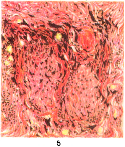 - На III — увеличенные отдельные узелки, диффузный фиброз, экзематозные изменения и признаки лёгочного сердца.