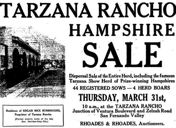 Британские издания книг о Тарзане и поступившие доходы от проката немых фильмов вывели заработки Берроуза на совершенно иной уровень в 1917 году. За книжное издание «Принцессы Марса» Эдгар получил 1000 долларов и 15 % роялти, тогда как от кинопроизводства доход достиг 55 000 долларов и 5 % роялти[52]. 4 декабря 1918 года Берроуз написал своему лос-анджелесскому врачу, что хочет вместе с женой навсегда обосноваться в калифорнийском климате. Переезд состоялся 14 января 1919 года; семейство было отягощено большим количеством мебели и автомобилем «Паккард»[53]. Сначала Берроузы разместились в меблированных комнатах, но Эдгар жаждал стать помещиком и искал ранчо, несмотря на предупреждения, что Калифорния, — это, в сущности, пустыня, которая лишь местами более или менее облагорожена и приспособлена для человеческого существования. 1 марта 1919 года он приобрёл поместье Харрисона Отиса «Миль Флорес» в долине Сан-Фернандо. Подробности на следующий день сообщала «Санди Таймс»: ранчо имело площадь 540 акров и располагалось в западной части долины к югу от шоссе Вентура. Участок был разделён на автономные секции, которые можно было сдавать в аренду или продавать. Эдгар немедленно присвоил своим владениям имя «Тарзана», которое планировал зарегистрировать как бренд. Поместье обошлось ему в астрономическую сумму 125 000 долларов. Жилой комплекс включал гимнастический зал, конюшню, просторный бассейн, кинотеатр на 150 мест, гостевые домики. От покойного генерала досталось стадо ангорских коз, которых Берроуз рассчитывал с выгодой разводить в предгорьях, а также завёл свиноферму. Однако уже в конце месяца на ранчо царила неразбериха[54][55].
