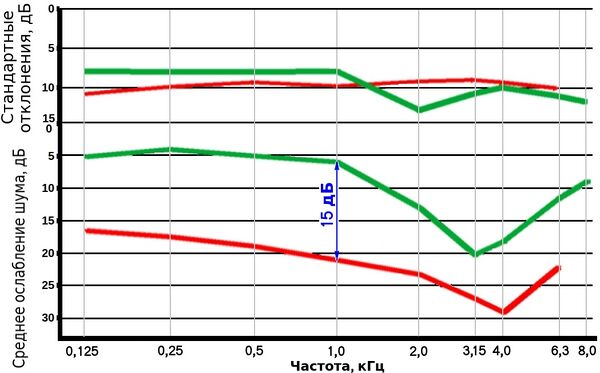 | Эффективная величина индекса ослабления шума противошумом NRR, дБ | 15 | 10 | 8 | 7 | 6 | 5 |