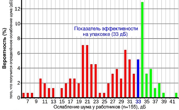 … СИЗОС разных типов, особенно вкладыши, при их применении работниками на производстве обеспечивают значительно худшую защиту, и гораздо большее разнообразие эффективности, чем можно ожидать при использовании лишь результатов сертификационных лабораторных испытаний.