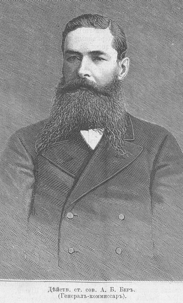 «Алексей Борисович Бер был высокого роста, шатен, носил темные очки. Он был большой работник, всегда поздно засиживался в своем кабинете за работой. Никогда за много лет не пропускал службу. Очень ровного характера, спокойный, очень остроумный, добрый, исключительно порядочный человек. Император Александр Третий ценил его и уважал. В домашние дела вмешивался мало, предоставляя это своей жене и теще, Софии Даниловне Анисимовой»[15].