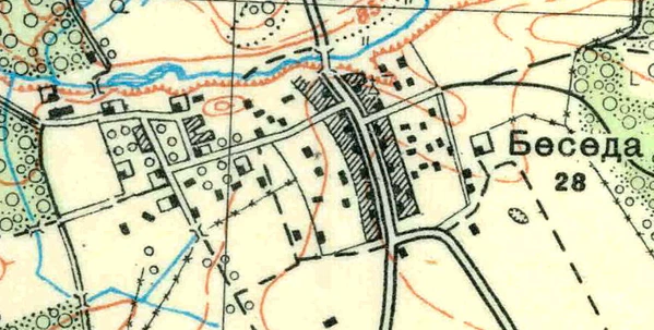 БЕСЕДА — деревня владельческая при речке безымянной, по 1-й Самерской дороге от Нарвского шоссе до р. Луги к д. Поречье, от Ямбурга в 25 верстах, число дворов — 22, число жителей: 67 м. п., 77 ж. п. (1862 год)[15]