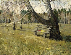 На картине изображена светлая поляна, покрытая разнотравьем, что подчёркивает жанр пейзаж. Справа в глубине выделяется развесистая берёза, под которой расположена деревянная скамейка со спинкой. На скамейке лежат красная книга и жёлтая косынка, внося элементы жанровой детали в композицию. Слева в глубине видны редкорастущие тонкие берёзы без листвы. На дальнем плане изображён берёзовый лес, что создаёт ощущение глубины и завершённости композиции.