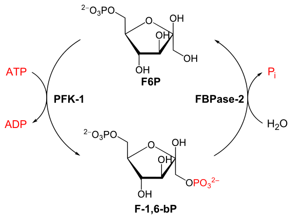 Бесполезный цикл (англ. futile cycle), также известный как цикл субстрата, или «холостой» цикл, представляет собой циклический биохимический процесс, возникающий, когда два метаболических пути одновременно проходят в противоположных направлениях и не имеют общего эффекта, кроме рассеивания энергии в виде тепла[1][2][3]. Причина, по которой этот цикл был назван «бесполезным» циклом, заключалась в том, что казалось, что этот цикл работает без чистой пользы для организма. Изначально этот процесс считался причудой метаболизма и, таким образом, был назван бесполезным циклом. После дальнейшего исследования было обнаружено, что бесполезные циклы очень важны для регулирования концентраций метаболитов[4]. Например, если бы гликолиз и глюконеогенез были активными одновременно, глюкоза была бы преобразована в пируват путем гликолиза, а затем обратно в глюкозу путем глюконеогенеза с общим потреблением АТФ[5]. Бесполезные циклы могут играть роль в регуляции метаболизма, где бесполезный цикл будет системой, колеблющейся между двумя состояниями и очень чувствительной к небольшим изменениям активности любого из вовлеченных ферментов[6]. Цикл действительно генерирует тепло и может использоваться для поддержания теплового гомеостаза, например, в бурой жировой ткани молодых млекопитающих, или для быстрого генерирования тепла, например, в летательных мышцах насекомых и у животных, находящихся в спячке, во время периодического возбуждения от оцепенения. Сообщалось, что цикл субстрата метаболизма глюкозы — это не бесполезный цикл, а регулирующий процесс. Например, когда внезапно требуется энергия, АТФ заменяется АМФ, гораздо более реактивным аденином.