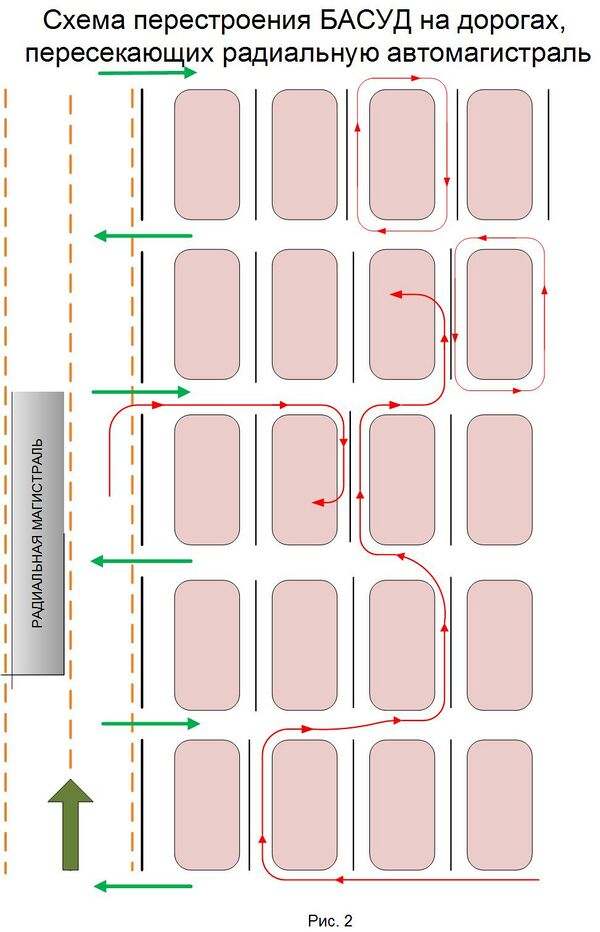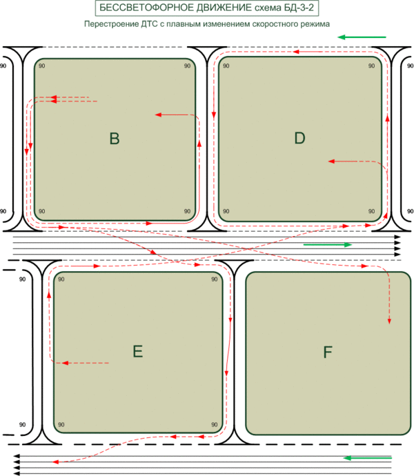 Решение вопроса организации бессветофорного движения городских дорожно-транспортных средств в двухмерном пространстве (на плоскости) в рамках действующих норм и правил упирается в обеспечение условий, при которых траектории непрерывно движущихся объектов могут пересекаться только при их перестроении. Предлагаемый способ организации движения кроме очевидных экономических экологических выгод обеспечит существенное повышение безопасности движения. Этот способ актуален не только для строящихся или быстро развивающихся городов, но может также успешно применяться для оптимизации дорожного движения больших городов.