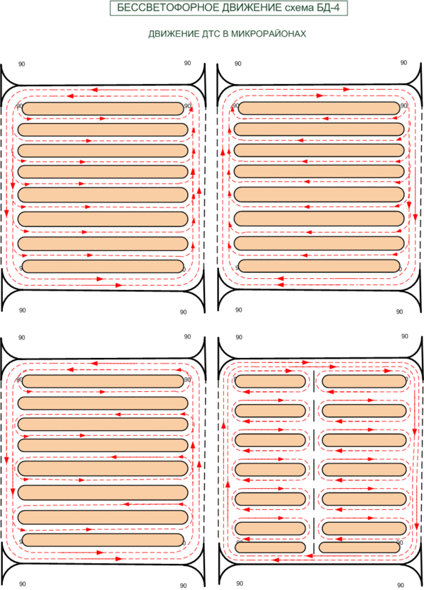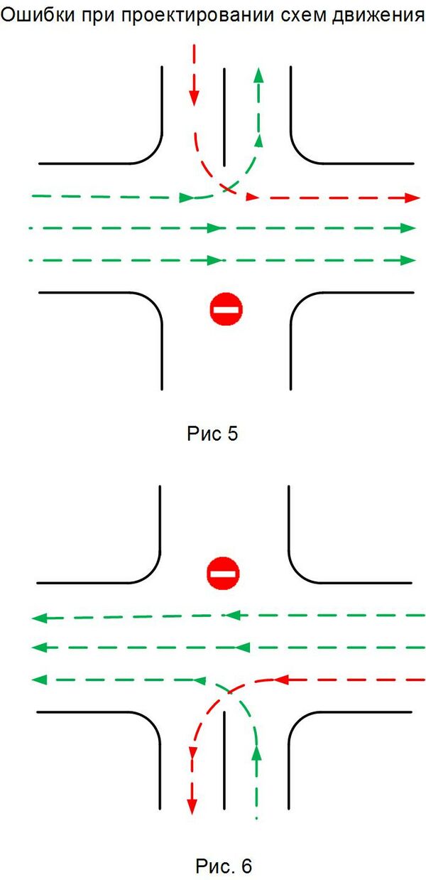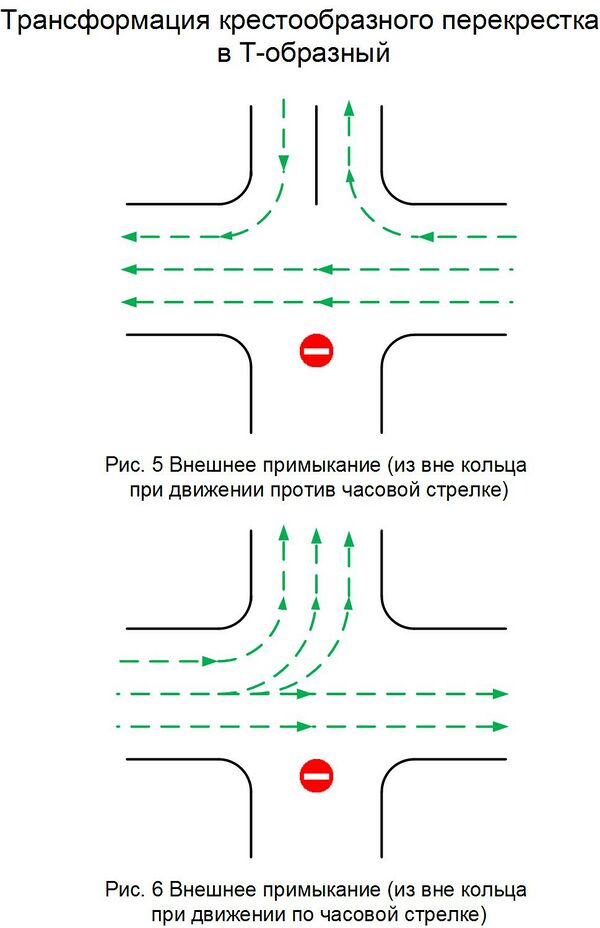 На рисунках 7 и 8 представлены варианты организации движения для дорог пересекающих кольцевое движение изнутри и извне, при которых невозможно обойтись без светофоров. Отсюда можно сделать вывод: для внутренней стороны кольца рационально направление движения — по часовой стрелке, тогда как для внешней стороны — против часовой стрелки.