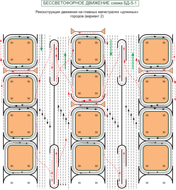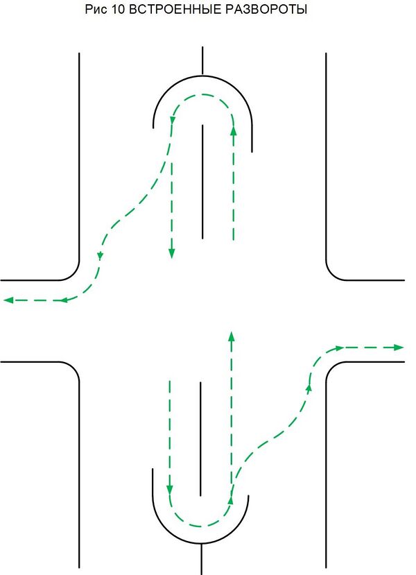 - Встроенные развороты — развороты, встроенные в основные магистрали, в местах наибольшего расширения дороги в рамках действия 3-го принципа (Рис. 10);