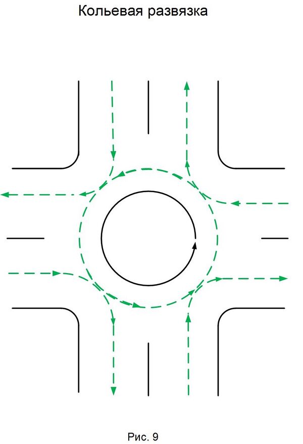 - Кольцевая развязка (движение по Кольцевой развязке осуществляется против часовой стрелки). Кольцевые развязки особенно эффективны при их применении в местах пересечения равнозначных основных дорог с интенсивным движением. Например, при пересечении радиальных автомагистралей с кольцевыми дорогами (Рис. 9).