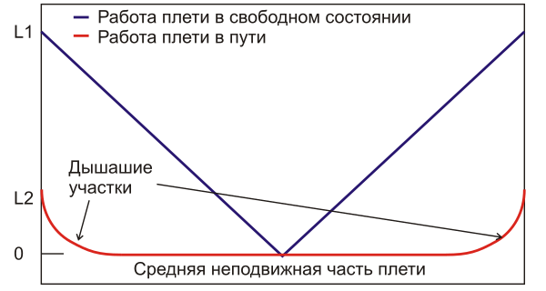 Таким образом, в работе бесстыкового пути, а точнее — в работе плети бесстыкового пути, перемещаются только концевые дышащие участки. Перемещения затухают в направлении от концов плети к середине и далее на большей части плети перемещения отсутствуют. Из-за того, что удлинения и укорочения плети в бесстыковом пути происходят не в полной мере, эти несостоявшиеся удлинения и укорочения выражаются в виде сил. Летом несостоявшееся удлинение плети может проявиться в виде выброса. Зимой несостоявшееся укорочение плети может проявиться в виде разрыва сварного стыка и раскрытия большого зазора.