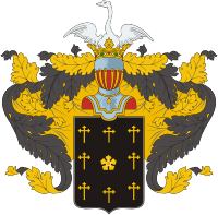 Описание герба: Выдержка из Общего гербовника В щите, имеющем чёрное поле, изображены восемь золотых крестов, положенных числом три, два, три и имеющих на трёх верхних концах крестообразыне перекладины, а между ними, на середине щита, пятилиственный золотой цветок. Щит увенчан дворянским шлемом и короной, на поверхности которой виден выходящий страус с распростёртыми крыльями. Намёт на щите чёрный, подложенный золотом.[1] |