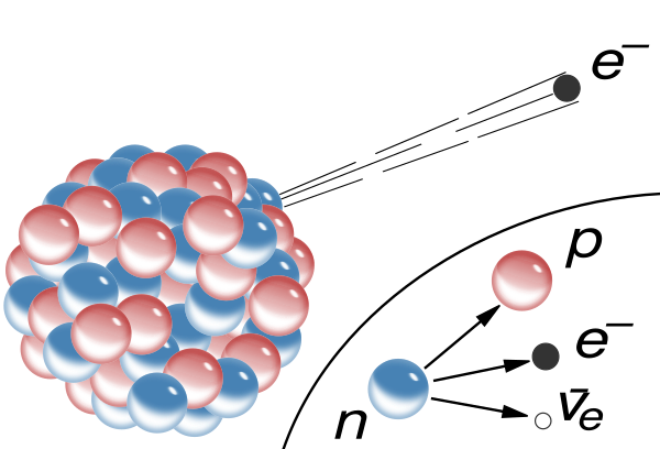 - β- частица — электрон. Образуется при распаде нейтрона по схеме , Где n — нейтрон, p + — протон, e - — электрон, — антинейтрино. По такой схеме распадаются как свободные нейтроны, так и много природных изотопов, имеющих избыток нейтронов.