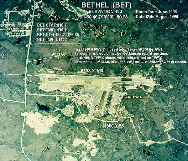 Аэропорт Бетел занимает площадь в 427 гектар (1045 акров), располагается на высоте 38 метров над уровнем моря и эксплуатирует две взлётно-посадочные полосы: