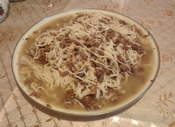 Тесто для лапши делают из муки, воды, яиц и соли, и оставляют на 40 минут. Затем тесто очень тонко раскатывают и нарезают на лапшу[6].