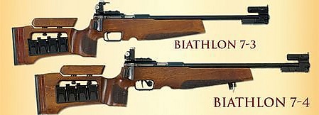 Вес винтовки составляет минимум 3,5 кг. Во время гонки винтовка транспортируется на спине. Запрещено автоматическое и самозарядное оружие[14]. Калибр патронов составляет 5,6х15мм (.22LR)[15]. Скорость пули при выстреле на расстоянии 1 м от среза ствола не должна превышать 380 м/с[11]. Наиболее распространены немецкие винтовки Anschütz и российские винтовки «Биатлон»[16][17][18].