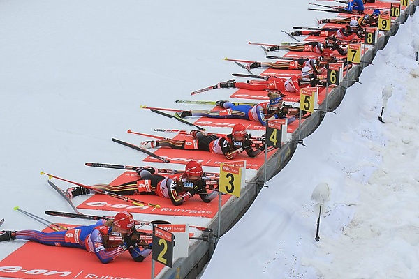 Во всех видах гонок, за исключением эстафеты, на каждом огневом рубеже в распоряжении биатлониста пять выстрелов. В эстафете спортсмен может использовать три дополнительных патрона на каждом рубеже, заряжаемых вручную. За нарушение правил безопасности или регламента ему грозит снятие с гонки. Самые частые причины дисквалификации включают стрельбу по чужой мишени, нарушение техники безопасности (ствол винтовки направлен не в сторону мишеней) и уход с коврика во время стрельбы[13].