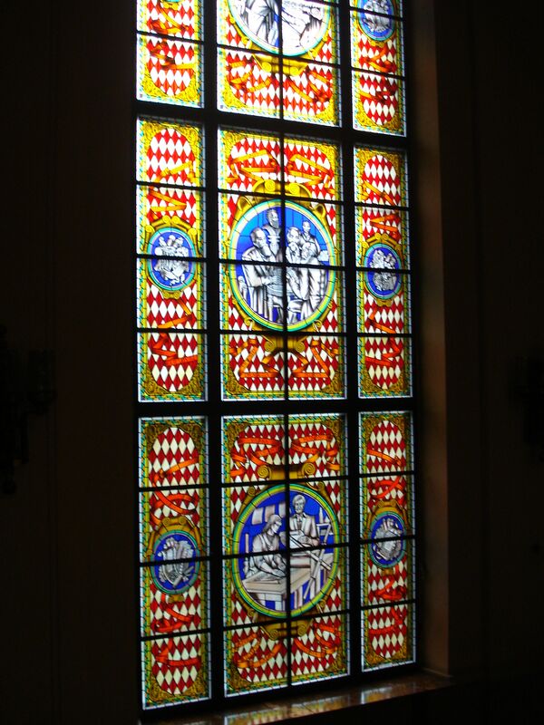 В окне вестибюля в 1979 году установлен витраж из тонкого цветного стекла, скреплённого полосками свинца, художника витражиста Бронюса Бружаса (мастер К. Курляндскас). Композиция витража размером 7×3 м симметричная. По оси симметрии расположены три больших медальона сложной формы с фигурными композициями. С двух сторон их обрамляют 6 медальонов меньшего размера с аллегорическими натюрмортами и орнаменты. Тема фигурных композиций и натюрмортов — история литовской науки: первая литовская книга (внизу), Литовское научное общество (в центре) и современная наука (вверху). Вокруг медальонов расположены сентенции на литовском и латинском языках.[7]