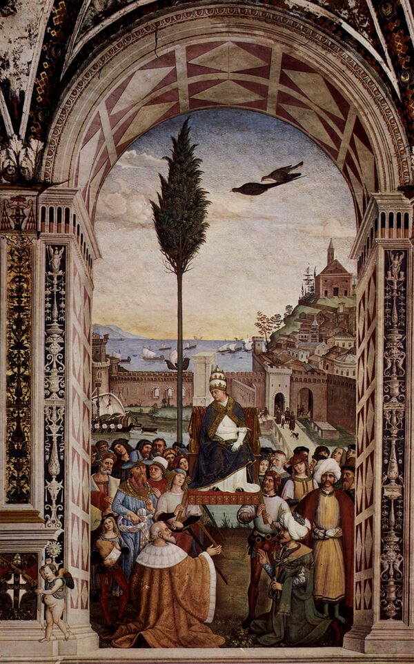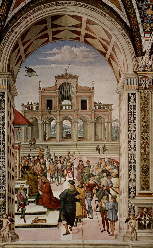 Живописное оформление библиотеки, одного из главных фресковых ансамблей Италии начала XVI века, было поручено Пинтуриккьо, художнику из Умбрии, который находился в то время на пике своей славы после успеха в Римской курии. Контракт был подписан 29 июня 1502 года. К 1503 году первый этап работ был завершён. 22 сентября того же года вдохновитель этой работы был избран папой Римским под именем Пия III, но умер 26 дней спустя. 18 октября строительство библиотеки было прервано, и Пинтуриккьо посвятил себя другим заботам, не покидая Сиену[2].