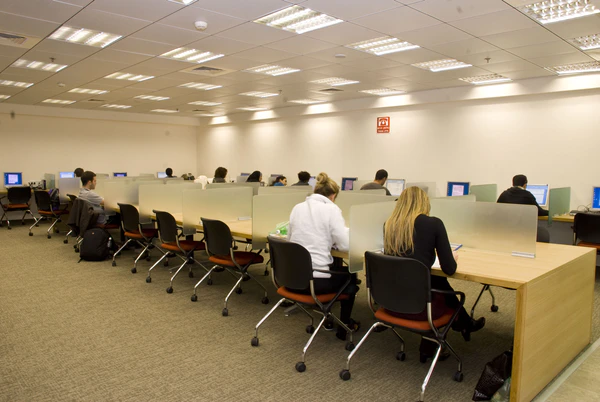 В читальном зале стояли десятки рабочих столов и стульев, угол наклона спинки которых был выбран из нескольких моделей путем опроса читателей.