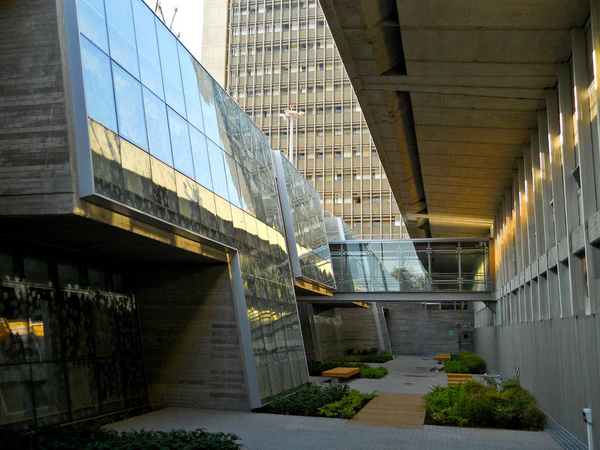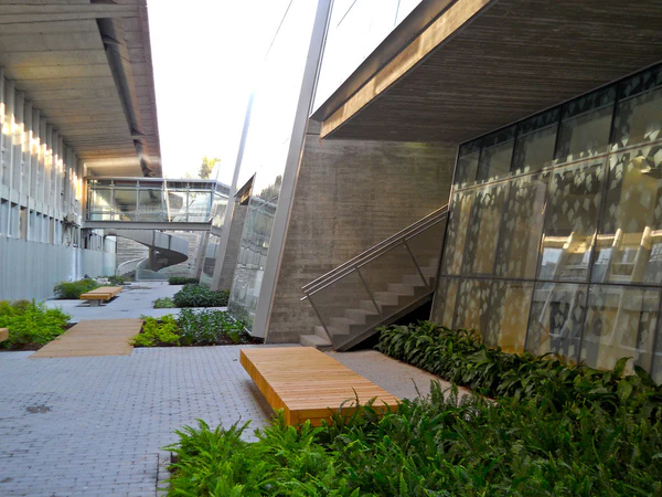 Оскар Нимейер спроектировал здание, в котором расположена библиотека, в стиле «бруталистической архитектуры».
