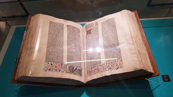 В октябре 1454 года Гутенберг и Фуст представили на ярмарке во Франкфурте первые тетради будущего издания. Сохранилось письмо сиенского епископа Пикколомини к кардиналу Кархавалю, в котором он пишет[3]: