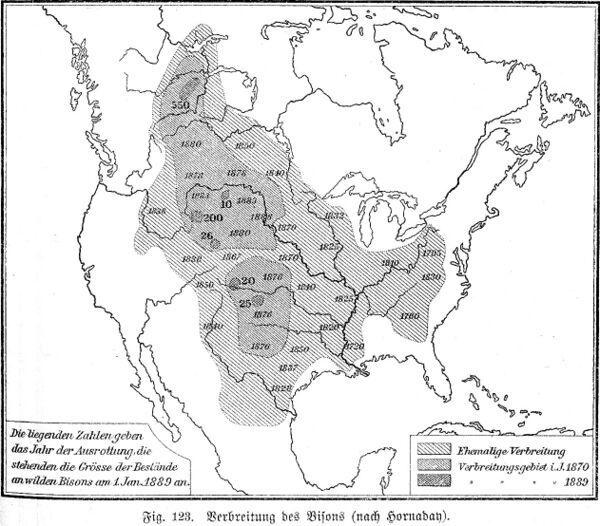В XIX веке популяция американских бизонов подверглась массовому истреблению в коммерческих целях. Огромное количество американских охотников убивали сотни тысяч бизонов ежегодно ради шкур, которые пользовались большим спросом как в США, так и в Европе. Американские скотоводы уничтожали бизонов, чтобы освободить территорию и ресурсы для своей живности. Мясом бизонов питались солдаты армии США из расположенных на равнинах постов, а также строители железных дорог. Охота на бизонов также стала популярным развлечением, привлёкшим даже Великого князя Алексея Александровича во время его посещения Северной Америки в 1872 году. Власти США неохотно шли на принятие мер для защиты популяции бизонов, осознавая пагубное влияние истребления на жизнь индейцев, которых правительство не без проблем пыталось переселить в выделенные в резервациях земли. По оценкам исследователей, в 1800 году численность бизонов составляла 30—40 млн животных, а к концу века они были почти поголовно истреблены: осталось менее одной тысячи[15]. Коммерческими охотниками, фермерами и просто ради развлечения в 1840-х годах ежегодно уничтожались около 2 млн. бизонов. Лишь с 1 из 3 убитых бизонов снимали шкуру и как-то использовали, остальных просто бросали, кости иногда использовались в качестве удобрения[16]. Создание национального парка Йеллоустон в 1872 году было первым событием, позволившим избежать полного исчезновения вида. Тем не менее, законы тех времён запрещали лишь коммерческую охоту на федеральных землях, что использовалось браконьерами для ухода от ответственности. Военные патрули не были в состоянии положить конец браконьерству, и только в 1894 году был принят закон, полностью запретивший любую несанкционированную руководством парка охоту на всех животных.