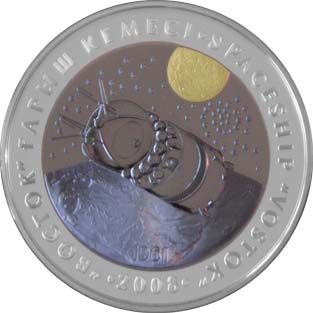 | Реверс: космический корабль на фоне Земли, позолоченного изображения Луны и звёзд, надпись «Космический корабль „Восток“» на каз. «ВОСТОК» ҒАРЫШ КЕМЕСІ и англ. SPACESHIP «VOSTOK», год полёта — «1961» и год выпуска. Материал: серебро-925 (кольцо, 14,6 г), тантал (центр, 26,8 г). Диаметр: 38,61 мм[8]. Тираж: 4000 шт. | ||