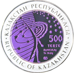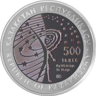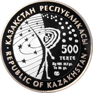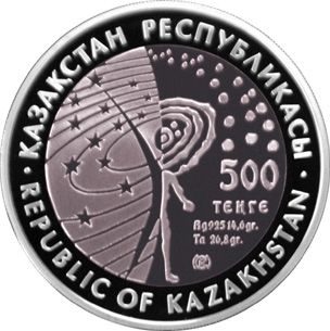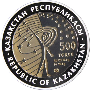 | Аверс: стилизованная композиция звёздного неба и двух человеческих фигур, название государства, номинал, знак монетного двора, год выпуска, масса и проба металлов. Реверс: Земля с обозначенной на ней территорией Казахстана, окружённая орбитами спутников в виде шанырака, название космодрома на каз. БАЙҚОҢЫР, рус. БАЙКОНУР и англ. BAIKONUR, звёздочки. Гурт гладкий. Материал: серебро-925 (кольцо, 14,6 г), тантал (центр, 26,8 г). Диаметр: 38,61 мм. Тираж: 5000 шт.[10] |
