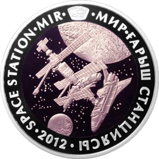 | Реверс: станция «Мир» на фоне Земли, Луны и звёзд, эмблема станции и её название на каз. «МИР» ҒАРЫШ СТАНЦИЯСЫ и англ. SPACE STATION «MIR», год выпуска. Материал: серебро-925 (кольцо, 14,6 г), тантал (центр, 26,8 г). Диаметр: 38,61 мм. Тираж: 5000 шт. | ||