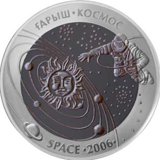 | Реверс: космонавт на фоне стилизованного изображения Солнечной системы и звёзд, надписи на рус. КОСМОС, каз. ҒАРЫШ и англ. SPACE, год выпуска монеты. Материал: серебро-925 (кольцо, 14,6 г), тантал (центр, 26,8 г). Диаметр: 38,61 мм[5]. Тираж: 4000 шт.[6] | ||