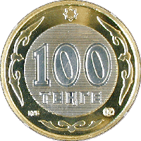 Биметаллические монеты номиналом 100 тенге чеканятся из нейзильбера (центральная часть) и нибрасса (кольцо).