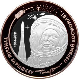 | Реверс: Юрий Гагарин в скафандре и корабль «Восток» на фоне звёзд, подпись космонавта, надписи на каз. ТҰҢҒЫШ ҒАРЫШКЕР и рус. ПЕРВЫЙ КОСМОНАВТ, даты «1961-2011». Материал: тантал (кольцо, 24 г), серебро-925 (центр, 16,7 г). Диаметр: 38,61 мм. Тираж: 5000 шт. | ||