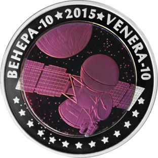 | Реверс: космический аппарат при подлёте к Венере и его названия на каз. ВЕНЕРА-10 и англ. VENERA-10, разделённые звёздочками, год выпуска. Материал: серебро-925 (кольцо, 14,6 г), окисленный тантал пурпурного цвета (центр, 26,8 г). Диаметр: 38,61 мм. Тираж: 3000 шт. |
