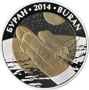 | Реверс: корабль на околоземной орбите и его название на каз. БУРАН и англ. BURAN, год выпуска. Материал: серебро-925 (кольцо, 14,6 г), окисленный тантал золотистого цвета (центр, 26,8 г). Диаметр: 38,61 мм. Тираж: 3000 шт. | ||