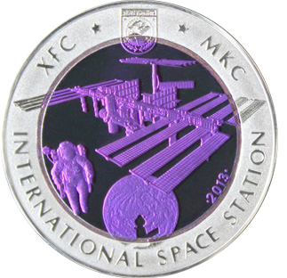 | Реверс: МКС и космонавт на фоне Луны, эмблема станции и её название на каз. ХҒС, рус. МКС и англ. INTERNATIONAL SPACE STATION, год выпуска. Материал: серебро-925 (кольцо, 14,6 г), окисленный тантал лилового цвета (центр, 26,8 г) . Диаметр: 38,61 мм. Тираж: 5000 шт. | ||
