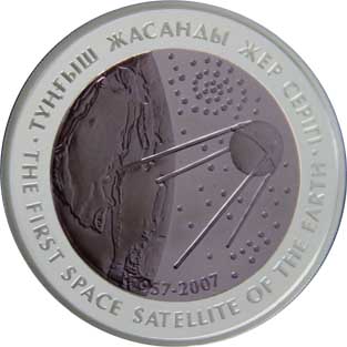 | Реверс: спутник на фоне Земли и звёзд, даты «1957-2007», надписи «Первый искусственный спутник Земли» на каз. ТҰҢҒЫШ ЖАСАНДЫ ЖЕР СЕРІГІ и англ. THE FIRST SPACE SATELLITE OF THE EARTH. Материал: серебро-925 (кольцо, 14,6 г), тантал (центр, 26,8 г). Диаметр: 38,61 мм[7]. Тираж: 4000 шт. | ||