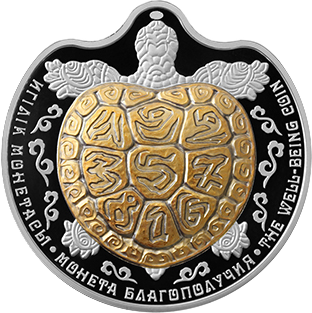 | Аверс: номинал в орнаментальном обрамлении, название государства, год выпуска, масса и проба металлов, логотип НБРК. Реверс: стилизованное изображение черепахи, надписи на каз. ИГІЛІК МОНЕТАСЫ, рус. МОНЕТА БЛАГОПОЛУЧИЯ и англ. THE WELL-BEING COIN. Гурт гладкий. Материал: серебро-925 (кольцо, 19,3 г), окисленный тантал золотистого цвета (центр, 20 г). Диаметр: 38,61 мм. Тираж: 1500 шт.[11] |