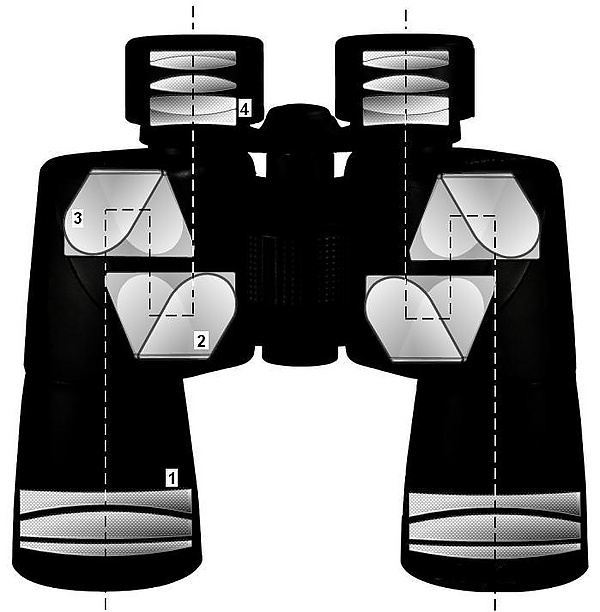 В апризматических биноклях между объективом и окуляром помещается оборачивающая система из одной или двух линз, повторно переворачивающая изображение. Центральный луч в каждой трубе идёт по прямой линии, без излома. Расстояние между центрами объективов равно расстоянию между центрами окуляров (то есть расстоянию между зрачками). Поэтому невозможно применение объективов диаметром больше 65 мм. Но главным недостатком таких биноклей является большая длина.