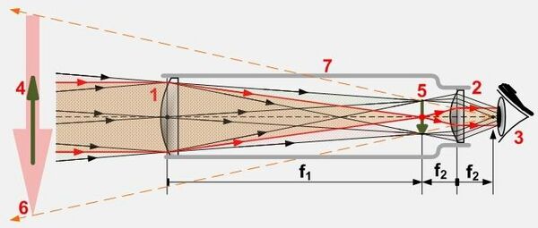 В биноклях с трубами Кеплера каждая зрительная труба имеет и объектив, и окуляр в виде положительной линзы. Как правило, обе линзы являются составными. Труба Кеплера способна давать высокое качество изображения при больших увеличениях. Но для этого свет должен пройти большое расстояние между объективом и окуляром. Другой (и главный) недостаток трубы Кеплера — перевёрнутое изображение. Для исправления перевёрнутости в биноклях используют переворачивающие линзы либо призмы.