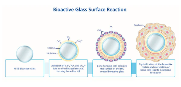 Ионы, высвобождаемые из биоактивного стекла при растворении, стимулируют гены клеток к регенерации и самовосстановлению.