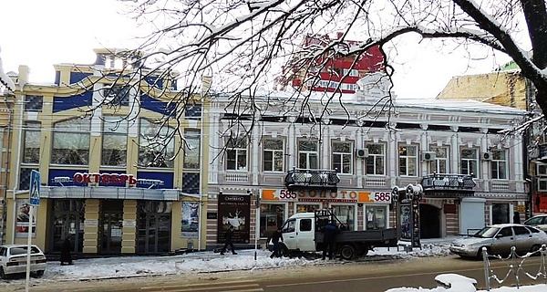 Восточное крыло (кинотеатр «Октябрь») с симметричной пятичастной фронтальной композицией выполнено в монументальных формах раннего модерна: с массивным аттиком, карнизом сложной криволинейной формы, широкими лопатками и витражными оконными проёмами с полуциркульным завершением. Фасад украшает характерная для модерна мозаичная «шахматная» композиция (одна центральная вставка и по две на флангах крыла). Строение гармонично вписано в прилегающую застройку между соседними особняками, стилистически выделяется и играет роль архитектурной доминанты квартала[2].