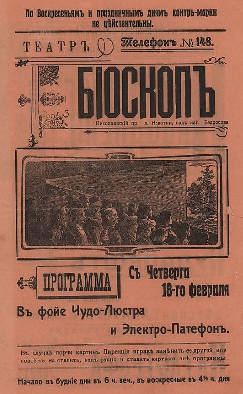 В структуре киносеанса было три части: видовые кадры, основная лента (драма либо комедия) и набор комических фрагментов (клоунады, отрывки из комедий). По мере развития отечественного кинопроизводства в прокате появились ленты российских режиссёров, включая ставшие всемирно известными фильмы «Отец Сергий» и «Пиковая дама» режиссёра Я. А. Протазанова[8].