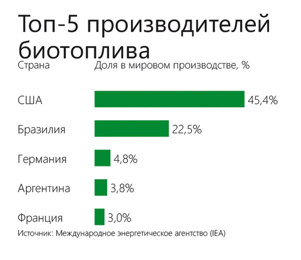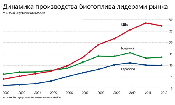 Более трети зерна в США, более половины рапса в Европе, почти половина сахарного тростника в Бразилии идут на производство биотоплива (Bureau et al, 2010)[41].