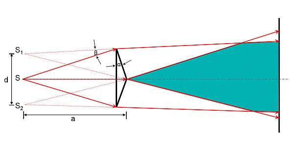 Величина расстояния между мнимыми источниками определяется углом поворота и расстоянием между источником света S и призмой; при малых для расстояния выполняется[4]: