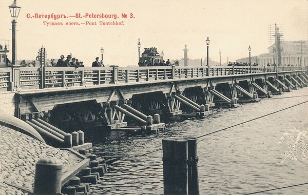 Строительство постоянного моста в этом месте стало возможным только после перевода торгового порта на Гутуевский остров в 1874—1885 годах[17][12]. В начале 1893 года по распоряжению городской управы инженером Николаем Мазуровым был составлен проект моста, утверждённый Александром III 19 мая того же года. Закладка моста состоялась 22 июня 1893 года[18]. Строительство заняло меньше года — освящение и открытие моста состоялось 27 марта (8 апреля) 1894 года в присутствии духовенства Князь-Владимирского собора, петербургского градоначальника, городского головы, коменданта Петропавловской крепости и других лиц[19][14].