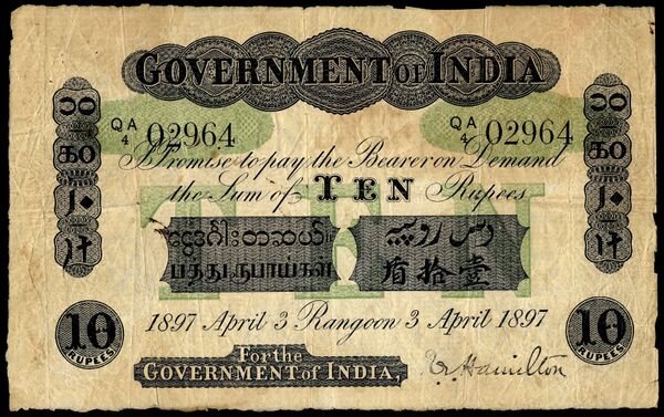 С 1897 по 1922 года специально для использования в Бирме были выпущены банкноты в 5, 10 и 100 рупий, которые отличались от индийских. В 1917 году были выпущены 2 ½ рупии, в 1927-м — 50 рупий, а в период между 1927 и 1937 годами — 100 рупий.