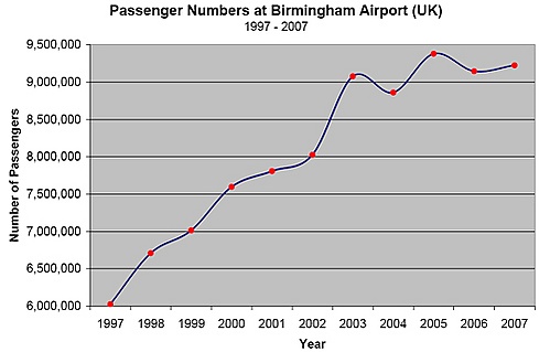 Услугами аэропорта в 2007 воспользовались 9,232,496 пассажиров (на 0,9 % больше, чем в 2006 и на 18 % больше, чем в 2001).[1] Аэропорт обеспечивает авиасообщение с другими аэропортами Великобритании, Европы, Индии, Среднего Востока и Северной Америки.