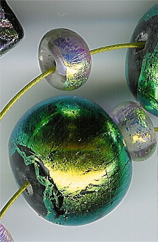 Затем тонкие стеклянные разноцветные трубочки разрезали ножницами гильотинного типа на мелкие кусочки, на сите отсеивали их от осколков и обрабатывали во вращающемся барабане увлажнённой шлифовальной смесью из толчёного угля с известью или огнеупорной глиной.